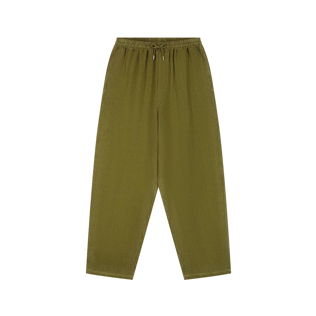 I pantaloni sono realizzati in un morbido tessuto di lino, ideale per le temperature più calde. La fascia elastica in vita con coulisse regolabile permette di adattare la vestibilità al proprio comfort, garantendo un look rilassato ma elegante. I pantaloni verdi sono completati da due tasche laterali e due tasche posteriori.