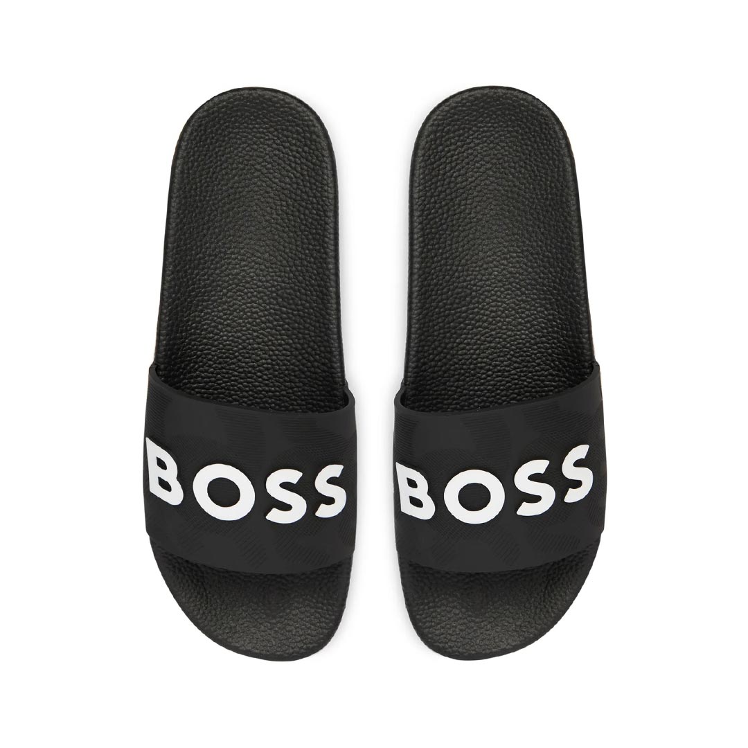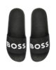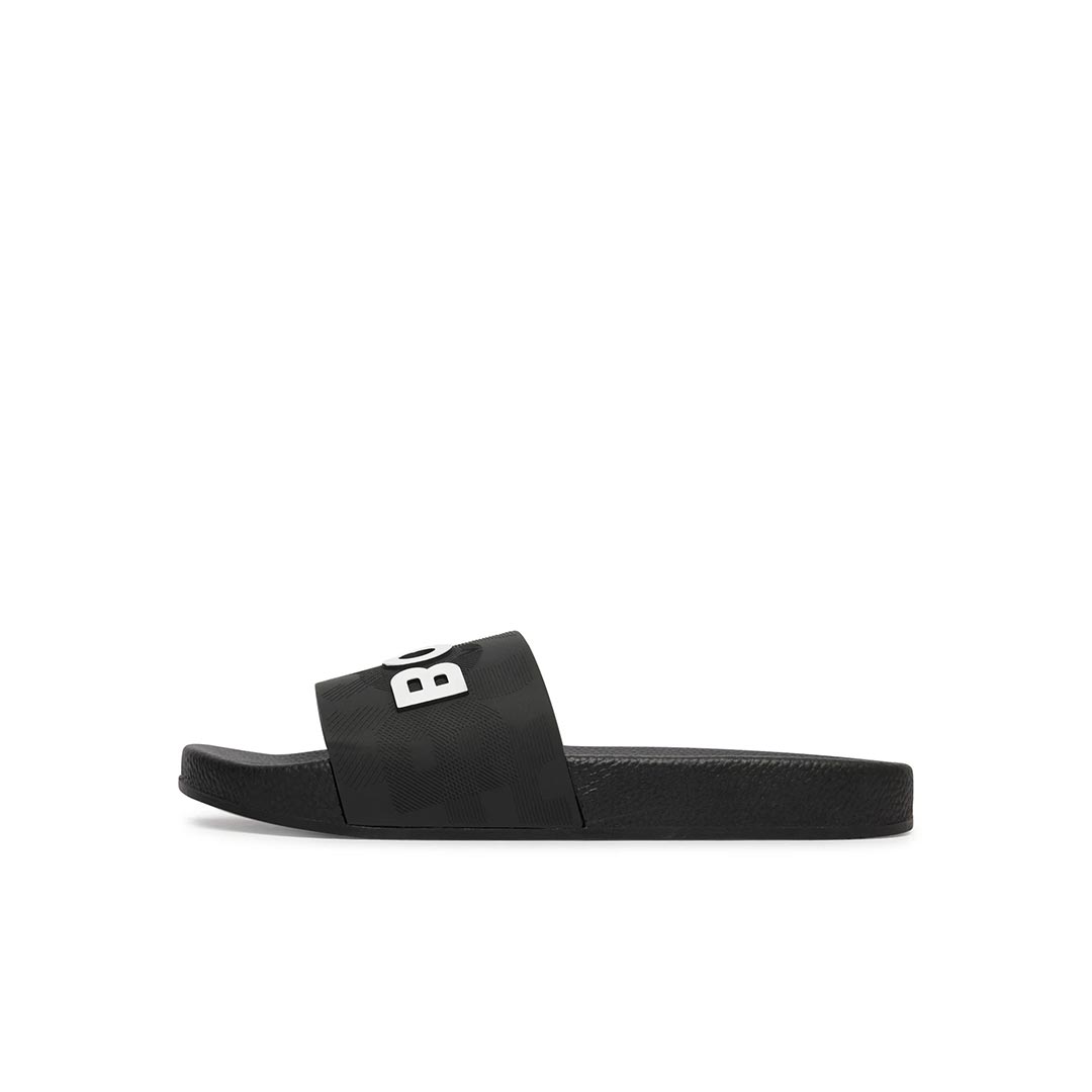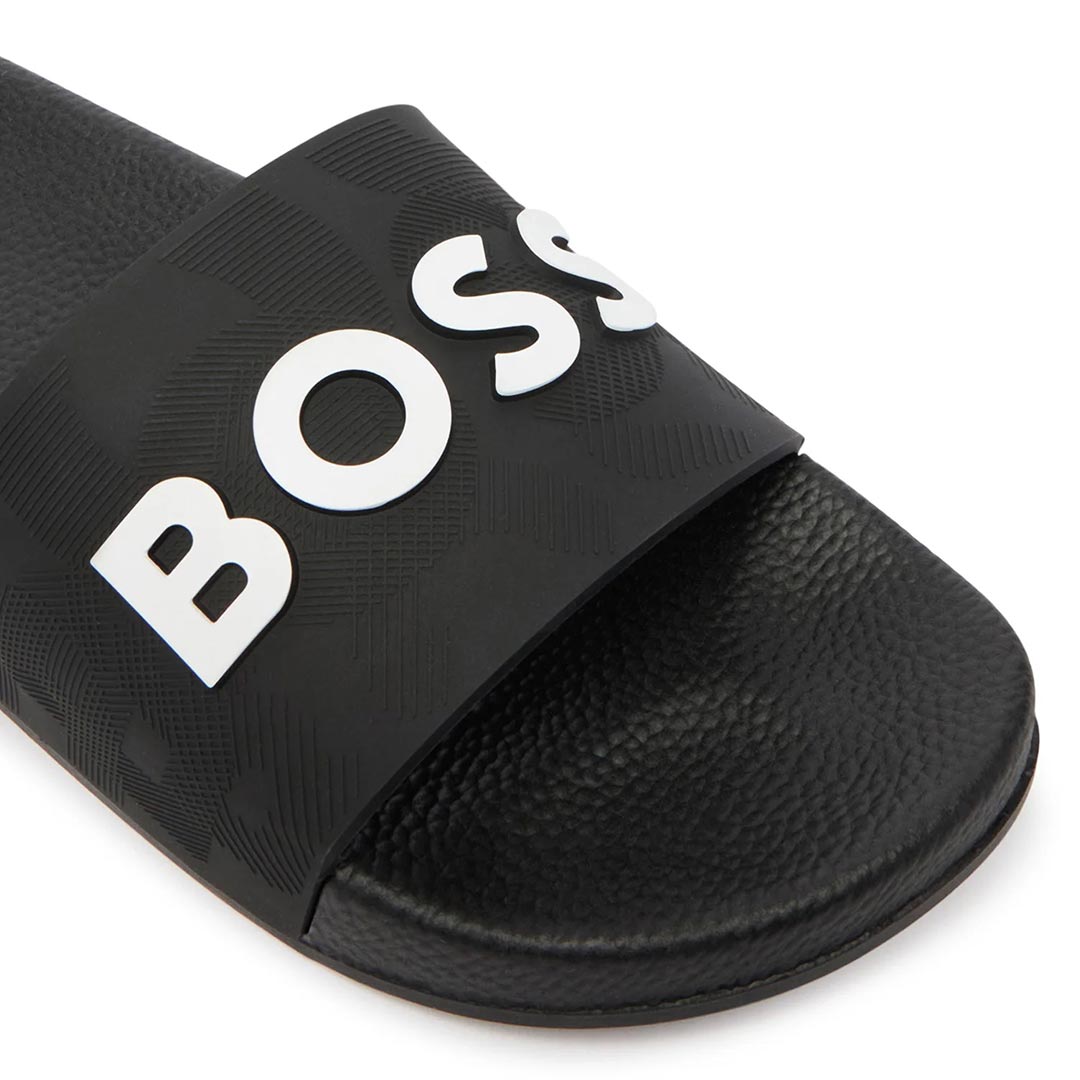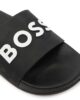 Ciabatte da bambino caratterizzate dal logo in contrasto di colore sulla fascia, suola in rilievo, punta aperta, design slip-on, suola piatta.