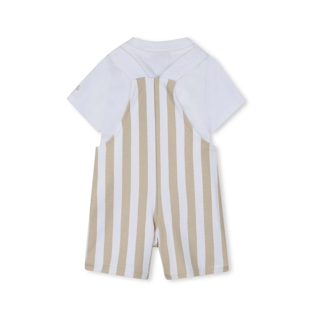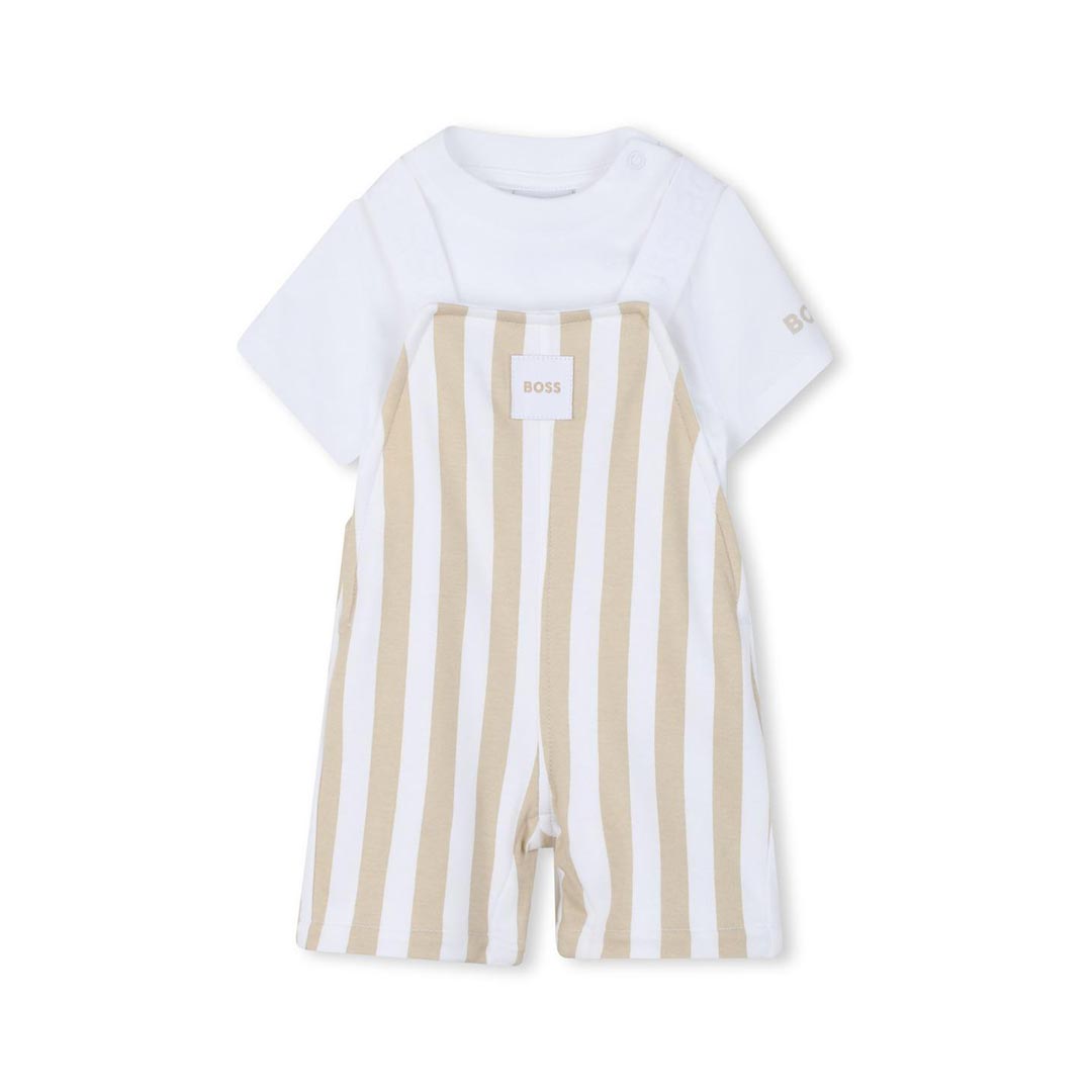 Set t-shirt e salopette per neonato Boss Kids multicolore con design a righe, logo sulla spalla, bottoni a pressione, toppa con logo sul davanti. Realizzato in cotone 100%.