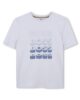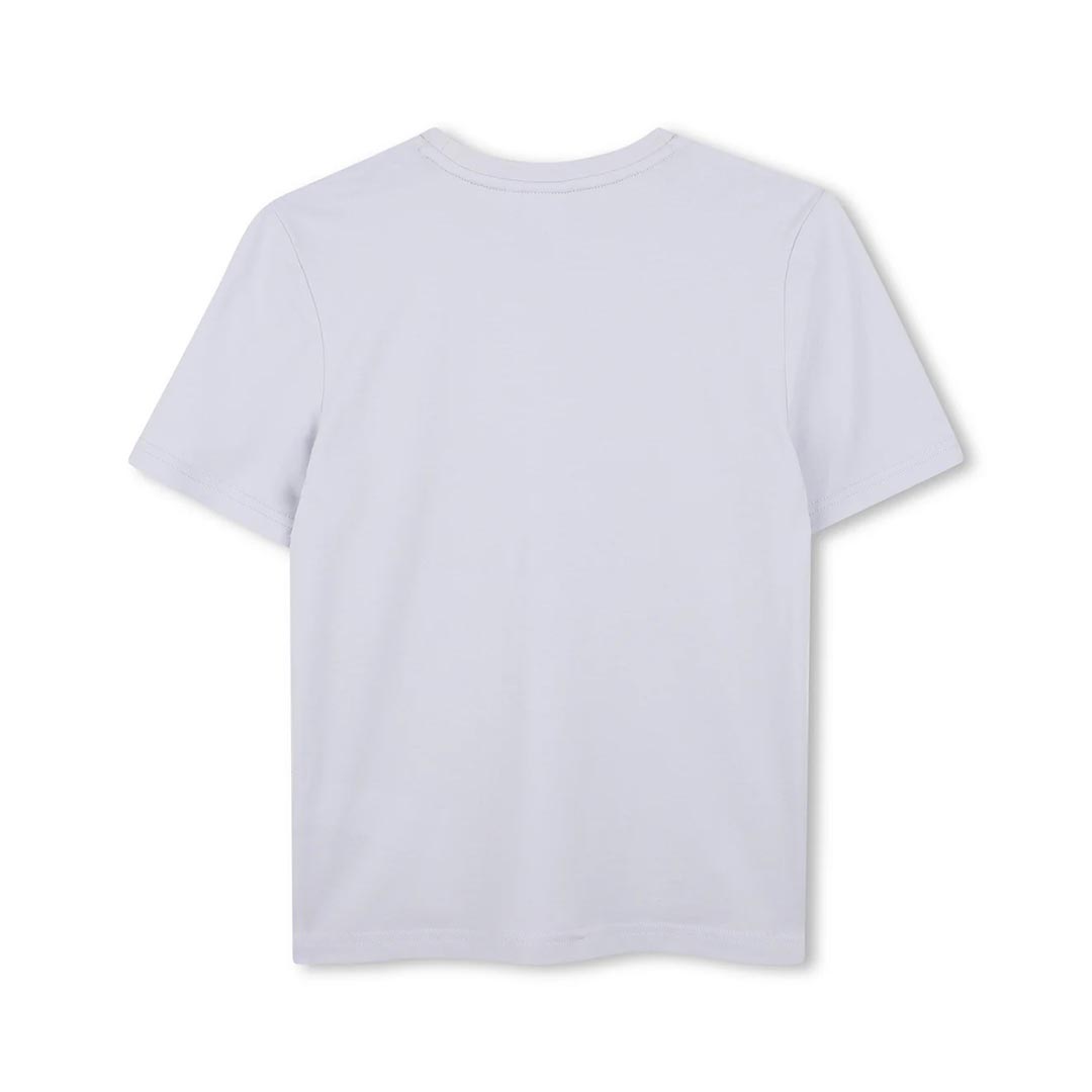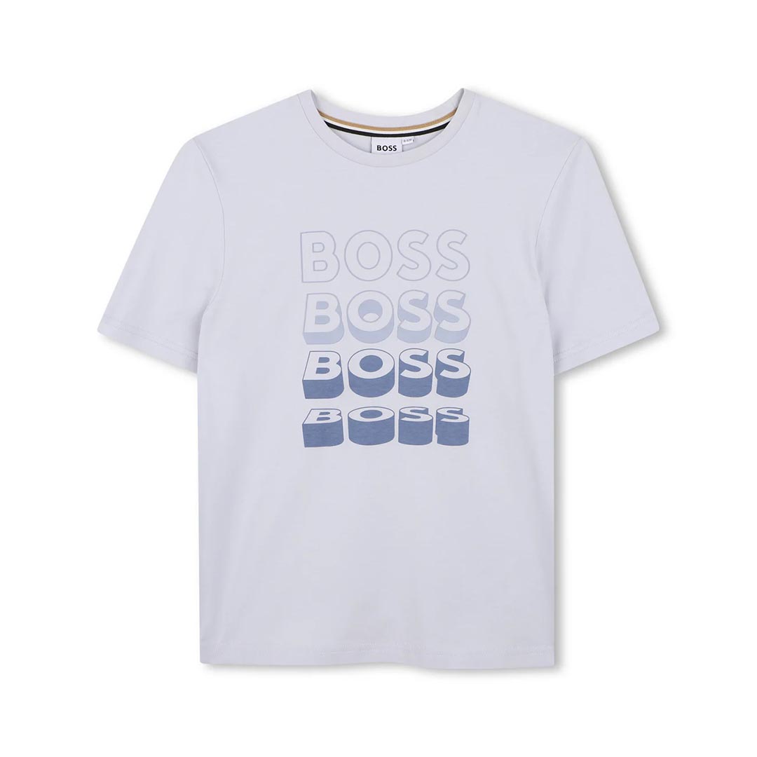 T-shirt bianca da ragazzo di BOSS. Realizzata in morbido jersey di cotone, presenta la stampa ripetuta del logo del marchio sul davanti.