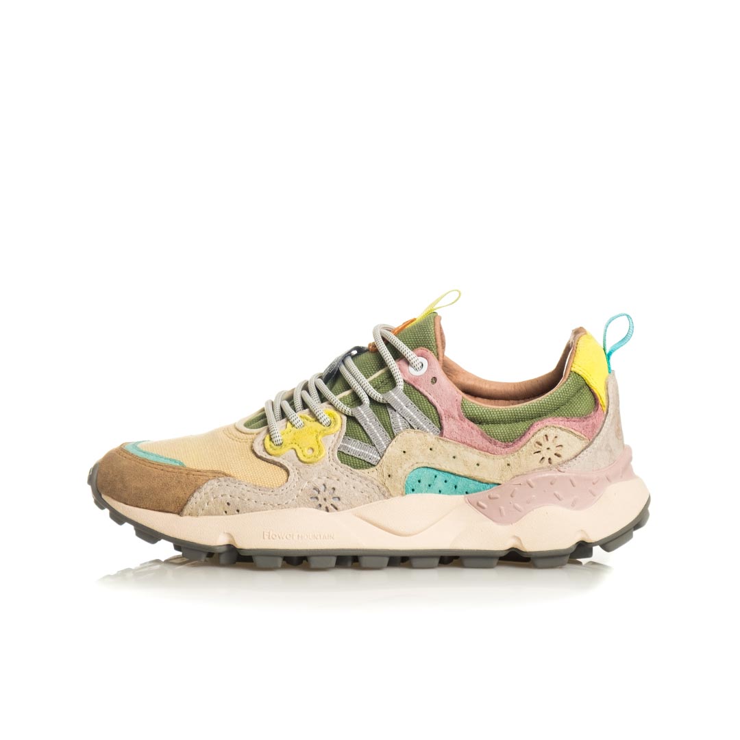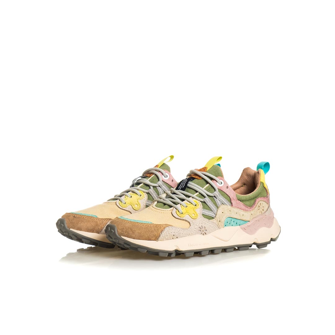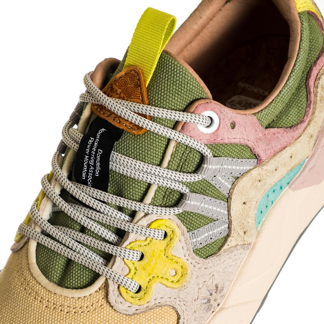 Sneaker in tessuto tecnico con dettagli in eco-camoscio coordinati. Dettagli traforati e occhielli rinforzati. Soletta removibile in sughero naturale, suola in gomma.