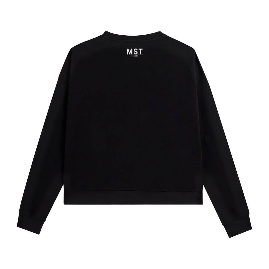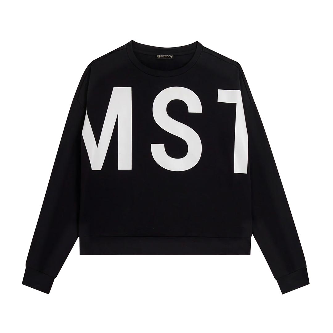 Felpa dal design minimalista e funzionale, realizzata in french terry elasticizzato di cotone, che offre una vestibilità comfort e una lunghezza appena sopra i fianchi. Il fondo è rifinito da una fascia, mentre lo scollo girocollo e le maniche con spalla molto scesa e polsini creano una silhouette rilassata. La maxi stampa MST sul fronte aggiunge un tocco deciso di stile, mentre la piccola stampa MST FREDDY sotto lo scollo posteriore completa il capo con un dettaglio elegante e discreto. Un capo che unisce comfort e raffinatezza.