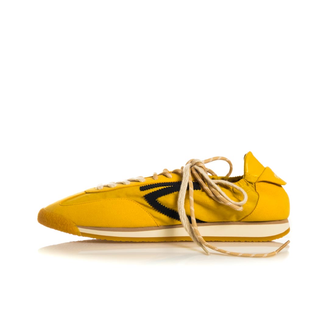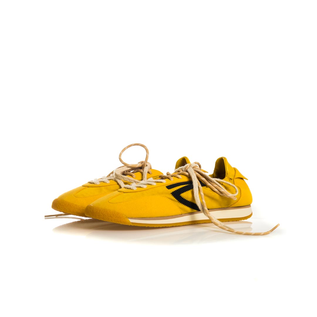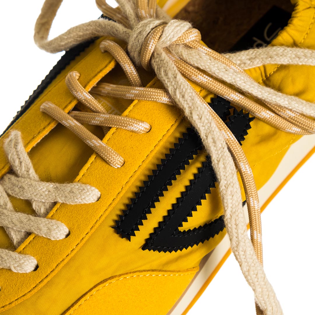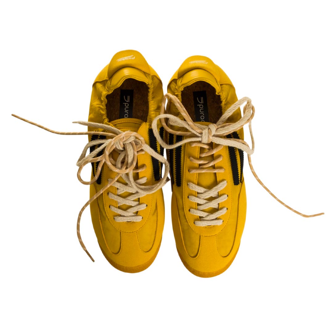 Sneaker Panther di Puraai – realizzati in nylon leggero e impreziositi da inserti in pelle scamosciata vegana. Una caratteristica speciale sono due lacci in cotone di colori diversi, perfettamente abbinati. Il design è completato da un rivestimento in pelle vegana a contrasto sul tallone e da una linguetta sul tallone con marchio tipico.