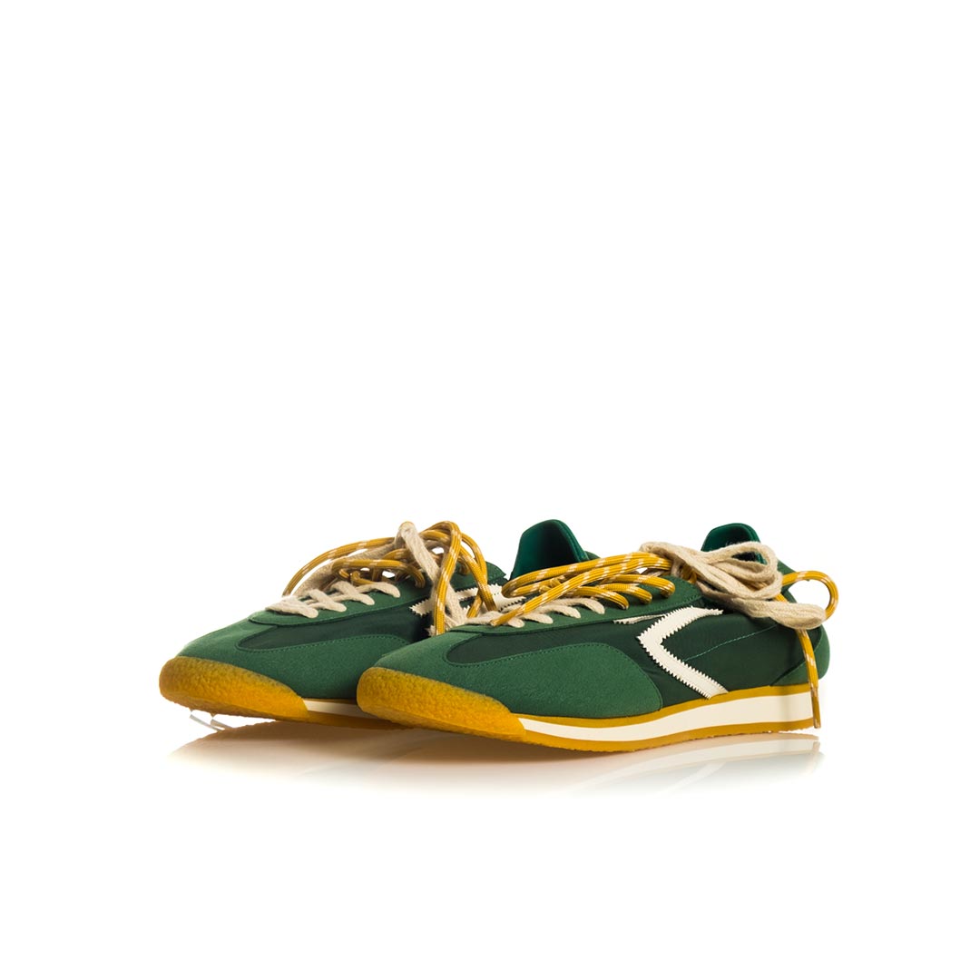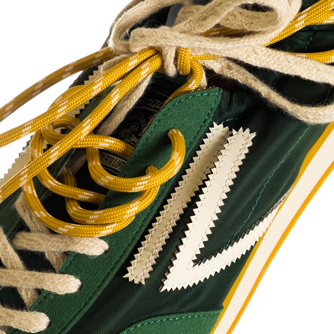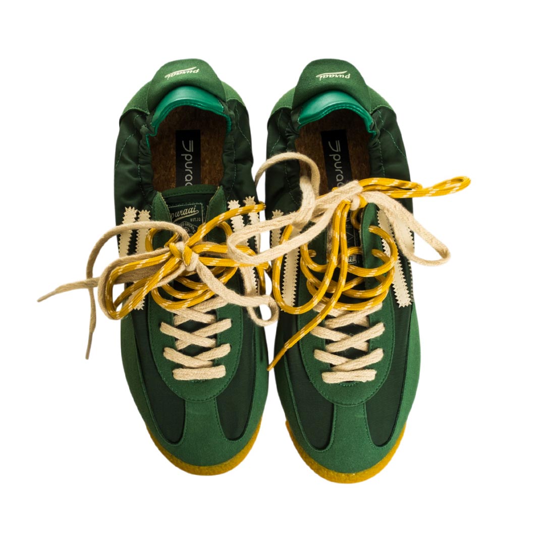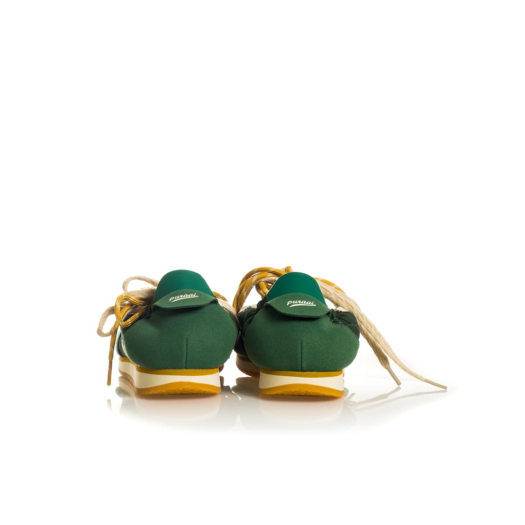 Sneaker Panther di Puraai – realizzati in nylon leggero e impreziositi da inserti in pelle scamosciata vegana. Una caratteristica speciale sono due lacci in cotone di colori diversi, perfettamente abbinati. Il design è completato da un rivestimento in pelle vegana a contrasto sul tallone e da una linguetta sul tallone con marchio tipico.