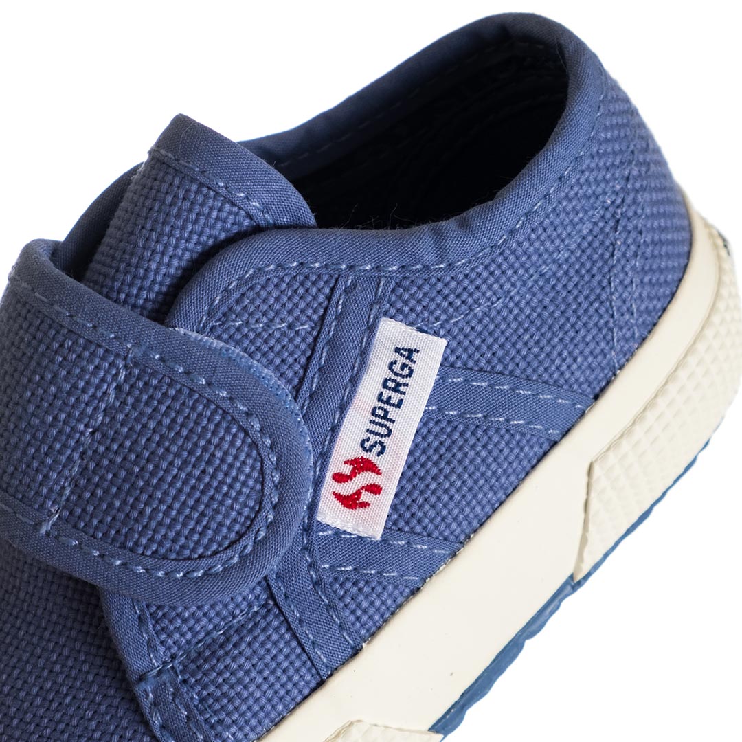 Massimo stile già dai primi passi. Questa Superga 2750 in versione baby presenta tomaia in tela di cotone, punta arrotondata e suola in gomma vulcanizzata tipica del brand. La chiusura con strap è un dettaglio super funzionale che assicura una calzata comoda e veloce.